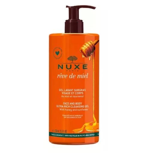 Nuxe Rêve de Miel Gel Lavante é um gel de limpeza ultra-rico, exuberante e deliciosamente semelhante ao mel, para um cuidado de limpeza suave, enquanto hidrata e acalma a pele seca e sensível do rosto e corpo.