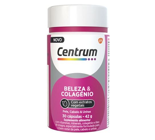 Centrum Beleza & Colagénio é um suplemento alimentar com vitaminas, minerais, colagénio e óleo de onagra para adultos, especialmente formulado para o bem-estar da pele, cabelo e unhas.