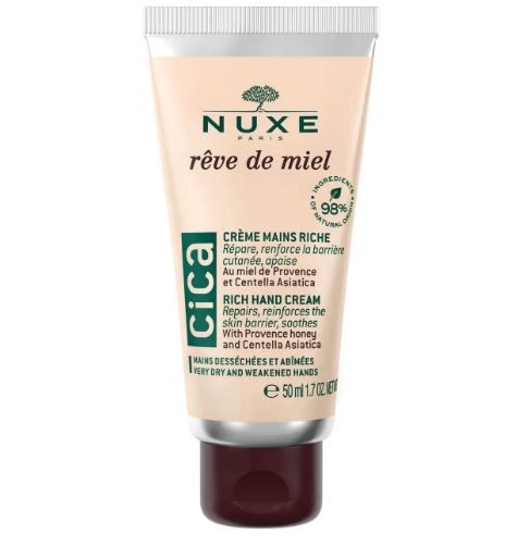 Nuxe Rêve de Miel creme de mãos Cica- repara e fortalece a barreira cutânea para mãos secas e danificadas.