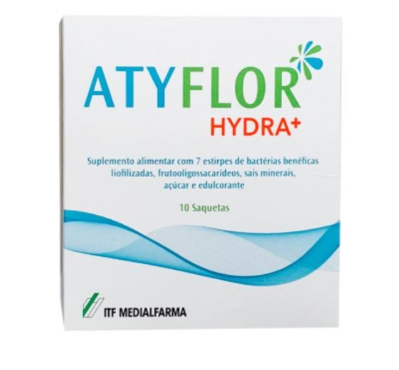 Atyflor Hydra+ é um suplementos alimentar com frutooligossacarídeos e 7 estirpes bacterianas que ajudam a regularizar a flora intestinal e também sais minerais que promovem a reposição de eletrólitos.