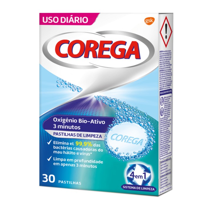 Corega Oxigeno Bio-activo Pastilhas de Limpeza proporciona uma limpeza rápida da prótese dentária.