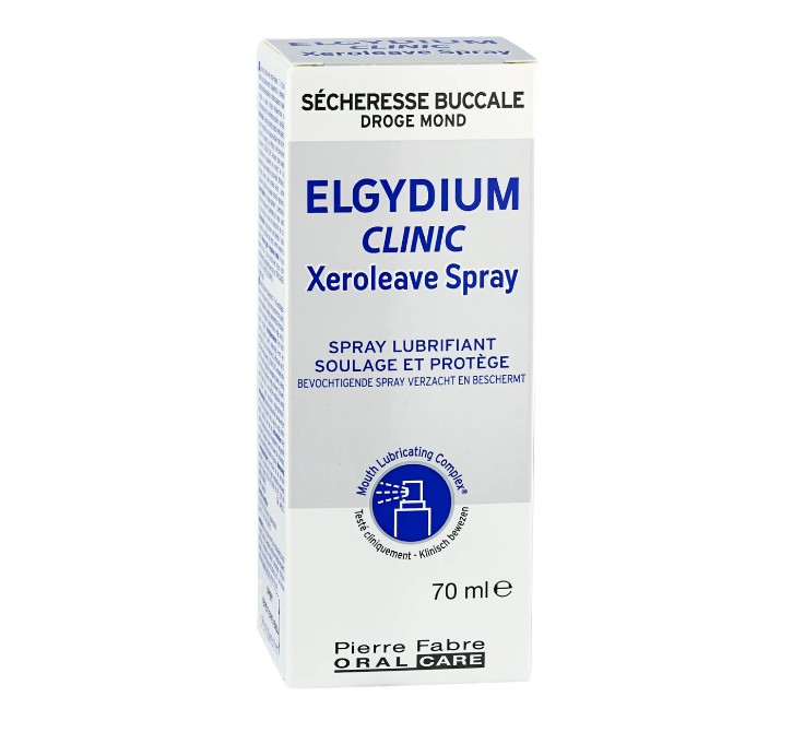 Elgydium Clinic Xeroleave Spray é um spray substituto salivar, com ação protetora e lubrificante das mucosas que alivia de imediato o desconforto da boca seca (xerostomia).