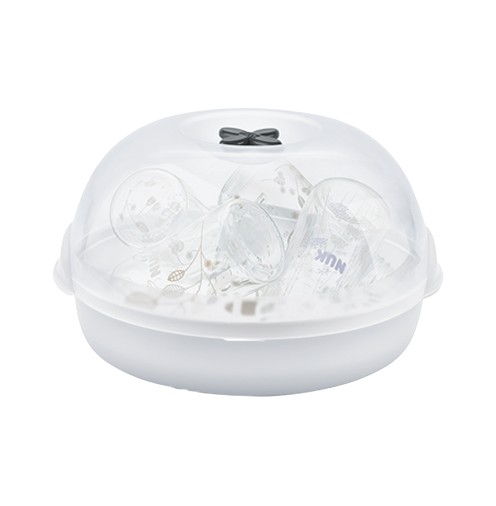 O Esterilizador NUK Micro Express para Micro-ondas esteriliza biberões (excluindo os biberões em PA - poliamidas), respetivos acessórios (excluindo chupetas) e acessórios da bomba tira-leite.