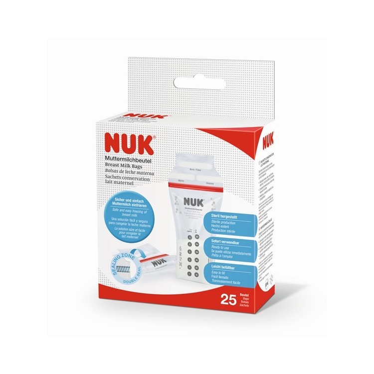 Os Sacos para Congelação de Leite Materno NUK são esterilizados e preparados para uso imediato.